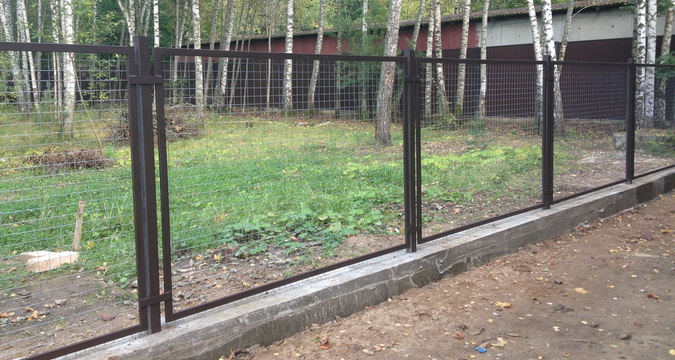 Как показано на фото, при установке такого забора своими руками натягивать проволоку и крепить ее к столбам нужно очень сильно, чтобы она не провисала: