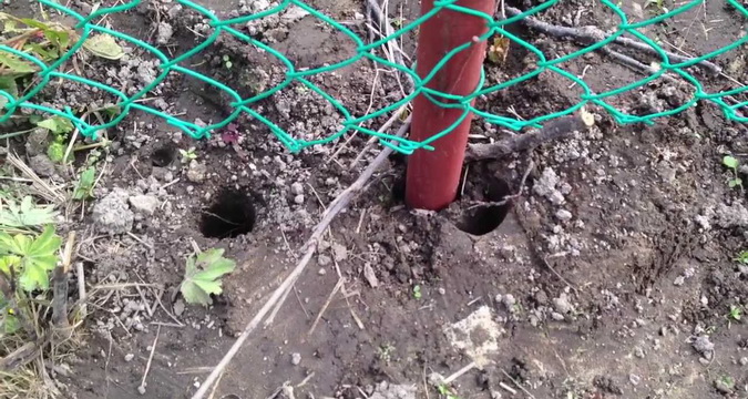 После этого устанавливаются столбы, к угловым крепятся боковые подпорки. В каждом натяжном столбе с помощью дрели нужно сделать 2-3 сквозных отверстия, через которые будут протянуты поперечные прожилины из проволоки-катанки.