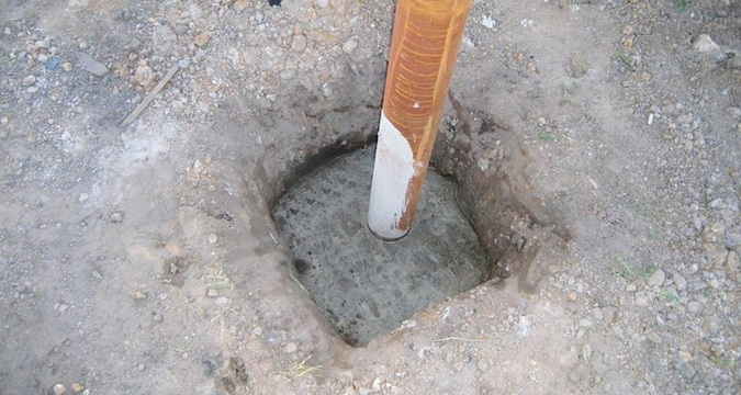 Перед тем как поставить забор, чтобы увеличить устойчивость и прочность конструкции, сначала в грунт забиваются металлические опоры, которые затем бетонируются методом заливания раствора в скважину. Такой способ бетонирования существенно повышает устойчивость к расшатыванию забора ветром и деформации его из-за сезонного вздутия грунта. Этот способ называется точечным бетонированием.