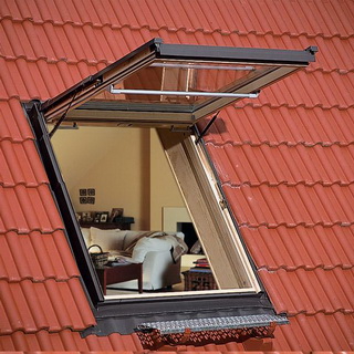За счет поворотной фурнитуры с горизонтальным подвесом окно можно поворачивать на 180° относительно горизонтальной оси. Данная фурнитура устанавливается на окнах с разной геометрией и весом — например, на эллипсовидных и круглых конструкциях. Этот механизм часто применяется в мансардных окнах.