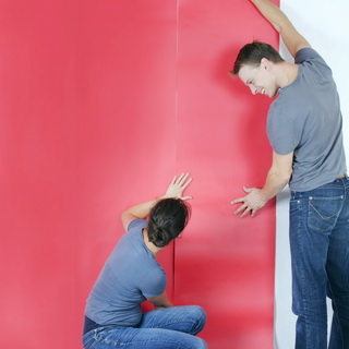 Полоса клеится от окна; при этом она должна находить на угол. Обои необходимо прижать шпателем и выровнять с помощью лазерного отвеса. Следующая полоса клеится встык таким образом, чтобы она не нарушала рисунок. Стыки обрабатываются с помощью валика. У плинтуса и потолка обои необходимо отрезать острым ножом.