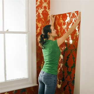Начинать работу следует от окна. Когда верхняя часть полосы наклеена, ее необходимо разгладить шпателем. Постепенно раскручивая рулон, обои наклеивают до пола. Чтобы обрезать полотно, используйте стальной шпатель или острый нож.