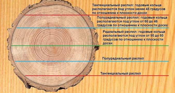 Тангенциальный распил отличается волнообразными линиями волокон. Такой материал отличается повышенной прочностью.