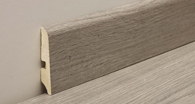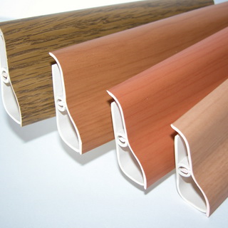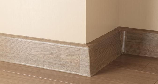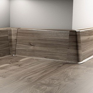 Ламинированный плинтус. Конструкция плинтуса следующая: на МДФ-основу наносится специальная пленка с рисунком под дерево. Для не совсем ровной стены ламинированный плинтус является идеальным дополнением, так как он обладает достаточной гибкостью. Он крепится на специальные пластинки, которые предварительно нужно установить по всему периметру комнаты. С обратной стороны плинтус оснащен пазами — вертикальными прорезями, с помощью которых он и насаживается на пластинки. Его всегда можно снять; кроме того, во многих панелях есть специальные полости для прокладки проводов.
