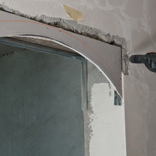 Перед тем как самостоятельно установить свод межкомнатной арки, необходимо надрезать материал поперек изгиба параллельными линиями на расстоянии 1 см друг от друга. Затем лист следует надломить по линиям разреза и выгнуть по месту. При монтаже такого ломаного листа необходимо проявить особую внимательность, так как сегменты соединены только лишь листом картона.