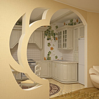 Проект сводчатой межкомнатной арки из гипсокартона, монтируемой своими руками, следует выбирать, исходя из особенностей помещений, между которыми она устанавливается. Например, если арку планируется смонтировать на входе в кухню из коридора, то следует учитывать, насколько выбранная форма арки будет сочетаться еще и со стилем отделки коридора. Также не стоит забывать и о размерах дверного проема. Если по высоте он меньше 2 м, то дверная арка еще больше «отхватит» и от без того небольшого пространства. В таком случае нужно устанавливать полноценную арку, а лучше просто закруглить верхние углы в проеме. Арка будет органично смотреться только в том случае, если расстояние между притолокой проема и полом будет больше 2,5 м.