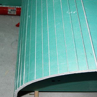 Если радиус изгиба небольшой, то рекомендуется использовать мокрый метод изгиба гипсокартона. Для этого лист следует перфорировать с одной стороны специальным игольчатым валиком. Затем его нужно смачивать водой до тех пор, пока впитывание ее не прекратится. Окончание впитывания будет заметно по глянцевой «зеркальной» поверхности листа.