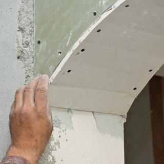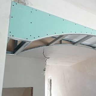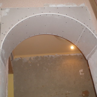 С округлым сводом гораздо сложнее. В нижней части его нужно обшить выгнутыми листами гипсокартона. Так как лист этого материала необходимо изгибать по форме каркаса, то для обшивки нижней части арки рекомендуется использовать потолочный гипсокартон. Он имеет намного меньшую толщину по сравнению со стандартным его видом, поэтому гнется гораздо проще. Способов аккуратного и неразрушающего сгибания гисокартона существует несколько. Рассмотрим основные из них.