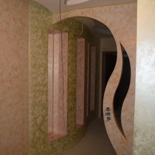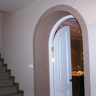 Еще одним популярным способом является отделка арки декоративной штукатуркой. При этом первоначально обрабатываемую поверхность необходимо зашпаклевать. Абсолютно ровной поверхности можно не добиваться, достаточно просто зашпаклевать швы, места, где присутствуют шляпки саморезов и заметные неровности. Затем поверхность нужно тщательно прогрунтовать. И только после того, как грунтовка полностью высохнет, на что может уйти около 1 суток, можно будет приступать непосредственно к нанесению штукатурки.