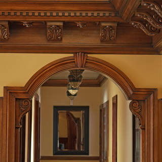 Монтировать наличник следует шкантами в карниз свода. В его паз, смазанный клеем, нужно вставить боковую панель так, чтобы верхний ее край вошел в паз свода. С другой стороны панели следует укрепить парный наличник. Затем симметрично необходимо смонтировать вторую половину арки.