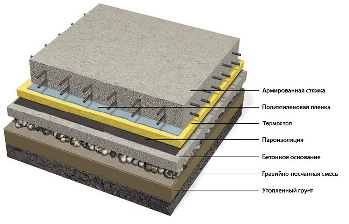 Противокапельная гидроизоляция предназначена для защиты пола от воздействия грунтовых вод. Для теплоизоляции лучше всего использовать водонепроницаемые материалы, которые выдерживают большие нагрузки. Поэтому лучше всего подходят для этих целей пенополистерол или минвата. Укладка гидроизоляции необходима только в случае, если для укладки предыдущего слоя была использована минвата. При пенополистероле в данном материале необходимость отсутствует. И завершающим этапом работ будет стяжка. Лучше всего реализовать стяжку по типу «глиняный замок», который будет гарантировать необходимую защиту всего вашего пола.