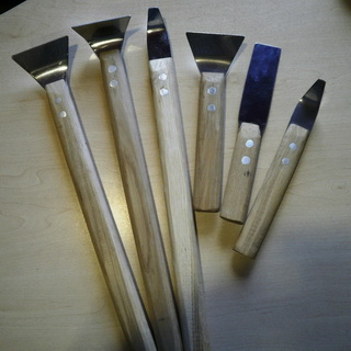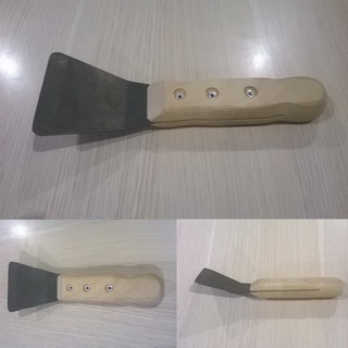Железные скребки изготавливаются из кровельной стали, которая нарезается пластинами в виде треугольников шириной от 5 до 10 см и длиной 15 см. К пластине крепится ручка, длина которой составляет 150 см. С помощью скребков удаляются клеевые и известковые пятна и иные незначительные неровности на поверхности стен или потолка. Для того чтобы работа была более эффективной, рекомендуется использовать скребки разных размеров.