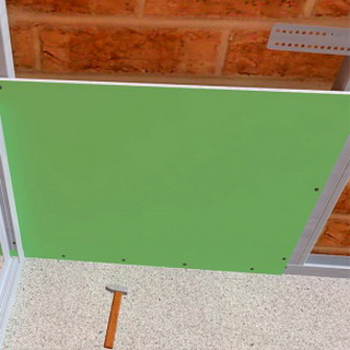 Все металлическое основание постепенно заполняется ГКЛ. Сначала идут в ход целые листы, а затем можно использовать и вырезанные куски. Возле дверных и оконных проемов нельзя использовать куски листов, в этих местах допускается использование только целых листов. В месте стыка ГКЛ прикрепляется промежуточный CD-профиль.
