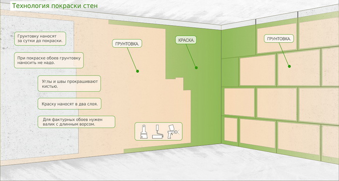 Описание этого этапа малярных работ выглядит следующим образом. Краска наносится на чистую сухую поверхность. Для окрашивания используется кисть, валик или распылитель. Наносить следующий слой краски можно только после того, как предыдущий полностью высох.