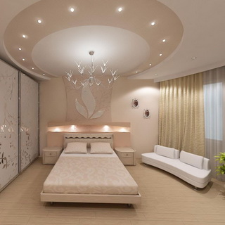 Этот вид потолочного покрытия монтируется из гипсокартонных листов. С помощью данного материала можно создать не только ровную поверхность потолка, но и многоуровневые и криволинейные композиции. Кроме того, в помещении можно осуществить монтаж точечных светильников, выделив какую-то одну зону или дополнив основное освещение.