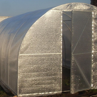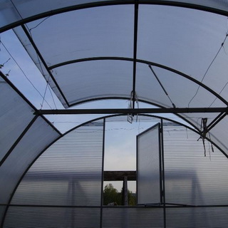 Эта теплица сохраняла целостность каркаса и пленки даже при ураганных ветрах, когда разрушались линии электропередачи. Теплица имеет ширину 5,5 м и произвольную длину. Она предназначена для выращивания овощей и рассады.