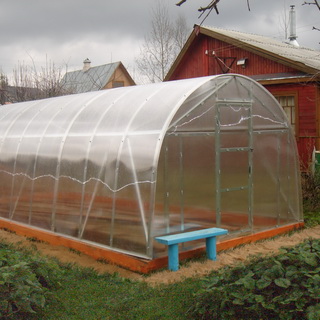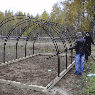 Обычно арочные теплицы своими руками делают из профильных труб с квадратным или прямоугольным сечением. Можно использовать стальные газоводопроводные трубы диаметром 25 мм. Длина трубы обычно стандартная и составляет 8 м. При изгибании трубы длиной 8 м в дугу получается арка, форма которой соответствует геометрически правильной полуокружности с радиусом 2,5 м. Монтируя арки на фундаменты, концы трубчатой арки для теплицы, возводимой своими руками, разводят на длину 5,5 м. Эта величина и составляет ширину теплицы. Высота теплицы в самой верхней части (конек) составляет 2,3—2,4 м. Таким образом, арка имеет практически циркульную форму, что очень важно для обеспечения плотного прилегания пленки к тепличной конструкции и достижения достаточной ветроустойчивости пленочного покрытия.