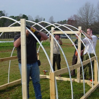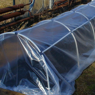Арочную теплицу можно изготовить из полимерных труб. Удобно использовать водопроводные пластиковые трубы, так как их можно гнуть, разогревая паром, и использовать комплект деталей, предназначенных для изготовления водопровода.