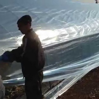 Их крепят к установленным брусьям с помощью деревянной рейки 20x40x3000 мм и гвоздей. После накрытия верхней части теплицы производят накрытие нижней части (от бруса до земли). В этом случае берут целое по всей длине теплицы полотнище. Один его край прибивают с помощью дранки и гвоздей к деревянному брусу, второй присыпают грунтом или песком.