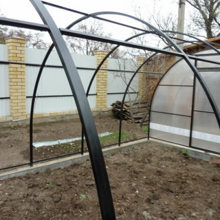 Изготовленные арки монтируются на фундаменты с помощью электросварки. Изготавливают фундаменты, используя железобетонные столбики сечением 120 х 120 мм и длиной 600—1000 мм.