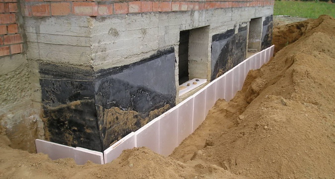 Поверхность фундамента очищают от грязи и выравнивают. На нее крепят какой-либо утеплитель – пенопласт, пенополистирол и т. п. А на всю оставшуюся ширину траншею засыпают песком или мелким щебнем.