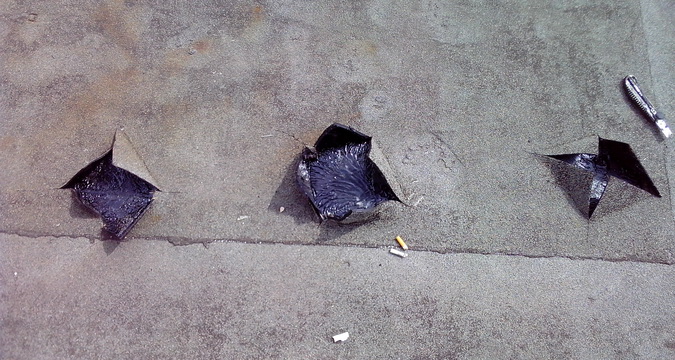 Затем приступают непосредственно к наложению заплат. Из нового рубероида вырезают кусок, в точности совпадающий по размерам с подготовленным отверстием. Отверстие заливают расплавленной смолой или промазывают битумной мастикой. Смазывать надо обильно, чтобы мастика заполнила всю площадь отверстия. Это послужит гарантией надежности отремонтированного участка.