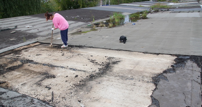 Если крыша вашего строения плоская, основанием кровли служит железобетонная плита. В этом случае зачищать крышу следует до бетона. Возможно, вы обнаружите на поверхности какие-либо неровности – бугры или выемки. Если неровности совсем мелкие, можно заделать их путем нанесения полимерной смеси. При более существенных неровностях придется делать бетонную стяжку.