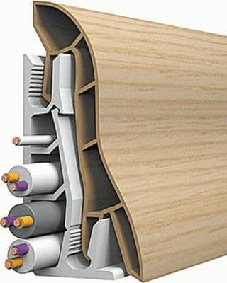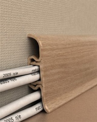 Для прокладки одиночных кабелей, например антенного, используют специальные плинтусы. Внешне они ничем не отличаются от обычных, но середина у них пустотелая и закрыта крышкой. С помощью данного плинтуса можно спрятать 1—2 провода, не устанавливая дополнительные короба.