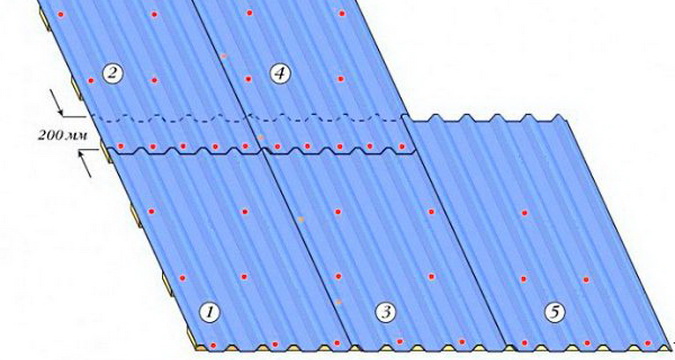 Существует два способа укладки листового железа. Первый, наиболее простой, это укладывание внахлест. Листы начинают укладывать от карниза. Их крепят к обрешетке с помощью кровельных саморезов, имеющих под шляпкой резиновую прокладку. Каждый следующий лист кладут внахлест на предыдущий, ширина нахлеста – 5—10 см. Место нахлеста для надежности стыка промазывают герметиком и прокладывают тонкой резиновой лентой.