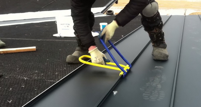 Кромку одного листа загибают вверх под прямым углом на 3 см. Кромку второго аналогично, но на 7 см. Соединяют листы и загибают большую кромку на меньшую. Эту операцию проделывают со всеми листами еще на земле. Затем расцепляют листы и поднимают на крышу. Там крепят их саморезами к обрешетке и сцепляют между собой подготовленным фальцем. Затем фальц уплотняют с помощью киянки и молотка. Фальцевание требует определенного опыта, поэтому при укладке кровельного железа своими руками обычно выбирают первый способ.