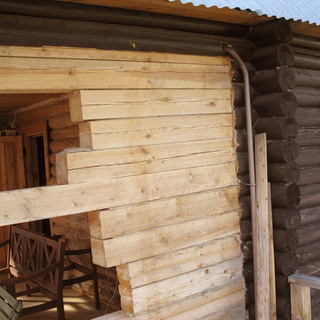 Поврежденный кусок просто выпиливают, а на его место ставят в точности совпадающий по размеру кусок нового прочного бревна. При замене участка бревенчатой стены новый кусок соединяют с соседними участками старого бревна с помощью металлических скоб. Один конец скобы забивают в старое бревно, другой в новое – по одной скобе с обоих концов нового куска. Вместо металлических скоб можно с торцов старого бревна прибить деревянные гребни и надеть на них новый кусок.
