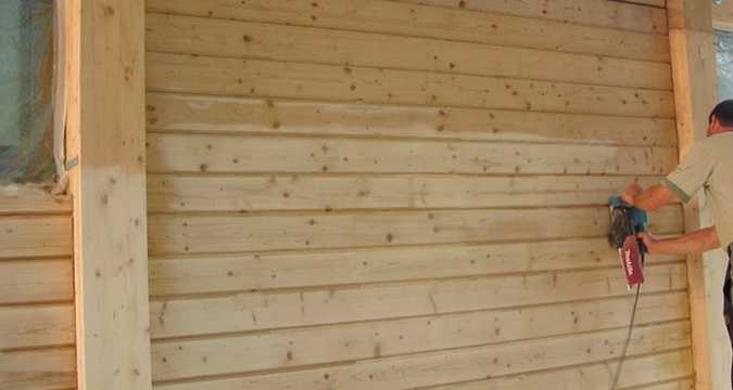 После того как был проведен ремонт всех поврежденных участков обшивки, доски пропитывают специальной антисептической пропиткой, грунтуют их и шпатлюют. Далее приступают к любому выбранному виду отделочных работ.