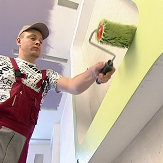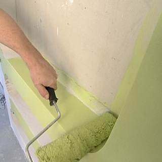 После того как прокрашены все сложные участки, переходят к основной покраске. Обычно при этом пользуются малярным валиком. Он удобен тем, что при обмакивании краска заполняет все его поры, а потом под нажимом валик постепенно отдает краску и частично ее растушевывает. Однако слишком много краски набирать все же не следует, иначе появятся подтеки.
