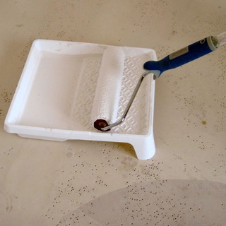 Для удобства набора краски на валик ее наливают небольшими порциями в малярный лоток.