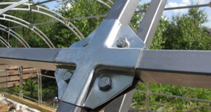 Рекомендуется поискать в продаже используемые в теплицах заводского изготовления легкие долговечные оцинкованные профили, скрепляемые болтами и гайками. Сваривать их не стоит, потому что сварка нейтрализует антикоррозийный эффект покрытий, да и сваривать такой материал для каркаса теплиц непросто.