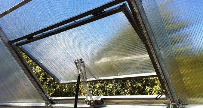 Ключевым элементом такой системы вентиляции в теплице выступает гидроцилиндр, состоящий из трубы, стержня круглого сечения и уплотнительных колец, связанных с форточками механизмом, который их открывает при повышении температуры. Форточки находятся в верхней части сооружения с одного или двух торцов. Последний вариант предпочтительнее, так как уменьшается вероятность образования конденсата и здоровье растений улучшается. Для вентиляции понизу теплицы также понадобится дополнительная фрамуга.