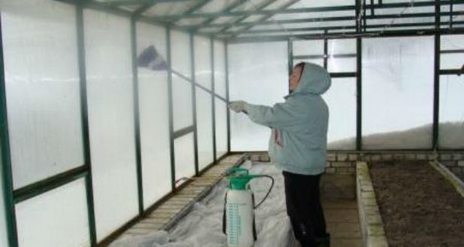 До того, как приступить к внутреннему уходу за теплицей весной или осенью, пропалывают грядки и удаляют сорняки из закоулков, в проходе. Подметают твердые поверхности и выносят сор, не выбрасывая его на грядки. Мобильные растения выносят из теплицы. Стекла моют и дожидаются, пока они высохнут. После чего растения можно заносить обратно.