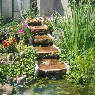 Сложнее создать систему из трех или большего числа приподнятых бассейнов, связанных между собой. Для их сооружения потребуется необходимое число мелких резервуаров для приподнятых бассейнов. Этот комплект емкостей соединяют друг с другом сливными желобами. При желании можно объединить их в большой бассейн. Выполненные из гибкого покрытия резервуары должны при необходимости перекрываться, чтобы из них не вытекала вода. Соединить резервуары несложно через систему каскадов. Тогда тройной каскад, стоящий в верхней части конструкции, распределит подаваемую насосом воду на 3 части, затем она попадет в расположенный ниже главный бассейн. Верхние элементы всегда обязаны перекрывать нижние так, чтобы вода переливалась только через сливной желоб, а не через край.