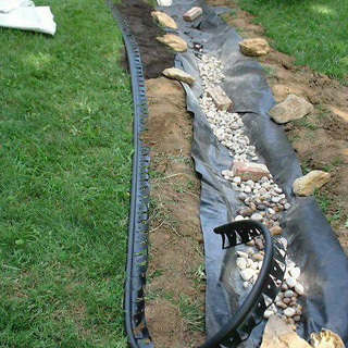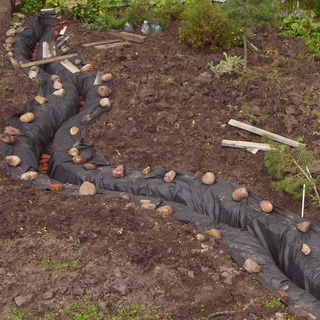При создании ручья на даче своими руками на песок нужно уложить геотекстиль, поверх него настелить пленку ПВХ для пруда. Пленку нужно тщательно проклеить и декорировать вдоль береговой линии так же, как и при строительстве искусственного пруда.