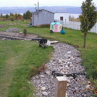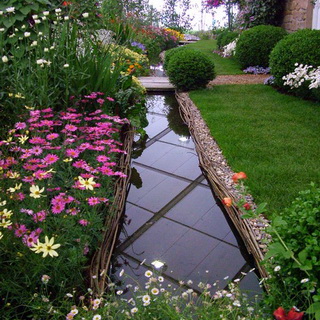 Путь воды несложно декорировать камнем и ввести в композицию декоративные растения. Струи воды в ручье способны быть активными, бурными или спокойными, журчащими. Ручей – это узкий поток воды со змеистым руслом, его создают незначительные перепады уровней воды, текущей по чуть наклонному руслу. Русло естественного ручья можно немного улучшить, придать ему некоторую живописность, устроив по ходу водотока несколько мелких перекатов. Даже самый малый уклон на местности несложно использовать для создания в ручье системы разнообразных живописных каскадов, нужно лишь изменить величину и форму камней или по-разному их уложить. На плоском участке, где почти нет естественного склона, можно устроить так, что перепад между истоком и устьем ручья окажется невелик, – необходим совсем небольшой уклон, чтобы вода стекала, а не застаивалась. Существенный момент при создании искусственного ручья на даче своими руками – это не слишком перестараться, чтобы не изменить водный баланс участка. Берега проточного водоема, имеющего русло, следует хорошо укрепить, чтобы во время половодья не случилось оползней и подмывания берегов.