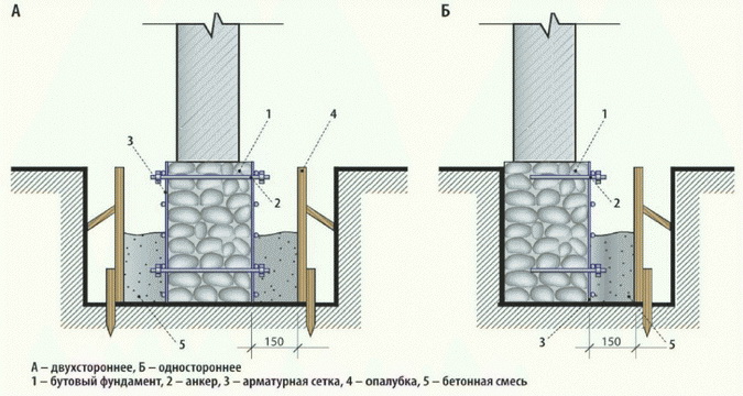 Армирование кладки производят точно так же, как для кирпичного фундамента, но на каждом ряду. После окончания кладочных работ лицевую сторону обязательно штукатурят и гидроизолируют с применением технологии, предусмотренной для бутобетонного монолита.