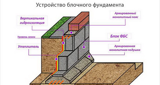 Работы, предваряющие закладку блоков в основание дома, проводятся методами, рекомендованными для устройства заглубленных монолитных фундаментов. В процессе подготовки важно учитывать силы пучения грунта, поэтому укладку блоков осуществляют с горизонтальной перевязкой.