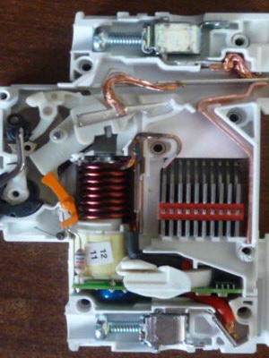 Внутри корпуса автомата располагаются предохранительные устройства. Их может быть два: тепловой и электромагнитный расцепители. Это особые механизмы автоматического прерывания цепи. Принцип работы теплового расцепителя заключается в том, что при прохождении тока недопустимо высокого значения через биметаллическую пластину она нагревается, распрямляется и размыкает контакты. По времени срабатывания такой расцепитель самый медленный. Электромагнитный расцепитель работает следующим образом. Катушка, находящаяся в центре автомата, поддерживается на месте стабильным напряжением. Стоит ему выйти за номинальные пределы, катушка буквально выскакивает со своего места, разрывая цепь. Такой способ разрыва цепи самый быстрый.