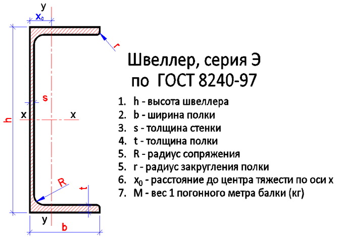 От других серий этот профиль отличается более тонкой стенкой. Размеры швеллеров серии Э, площадь поперечного сечения, вес 1 погонного метра, а также другие характеристики и справочные величины данного металлопроката представлены в таблицах.