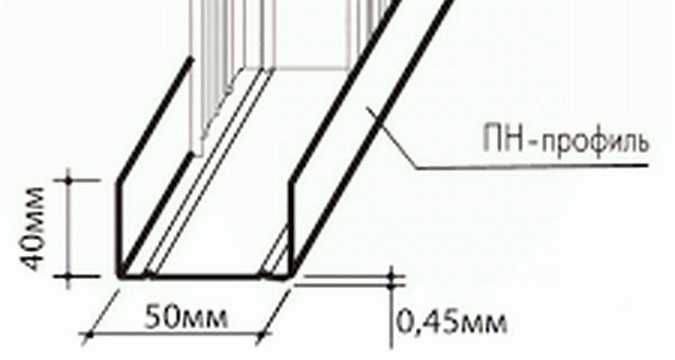 Во-первых, это направляющие для сборки каркаса — ПН или UW. Их стандартные размеры, следующие: глубина — 40 мм, ширина — 50 мм, 75 мм и 100 мм (в зависимости от толщины стены). Это изделие по виду напоминает рельс и является основой для последующего крепления стоечных и потолочных направляющих профилей.