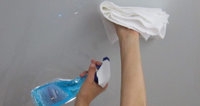 Как показывает практика, очистить потолок от старой меловой побелки можно обычной водой, а известковой — слабым мыльным раствором. Ржавые пятна на потолке и потеки сначала нужно отмыть водой, а затем обработать эти места медным купоросом. Закопченные потолки рекомендуется протереть 2-3% -м раствором соляной кислоты. Работая с кислотой, следует принять меры предосторожности: защитить глаза специальными очками, на руки надеть перчатки и т. д.