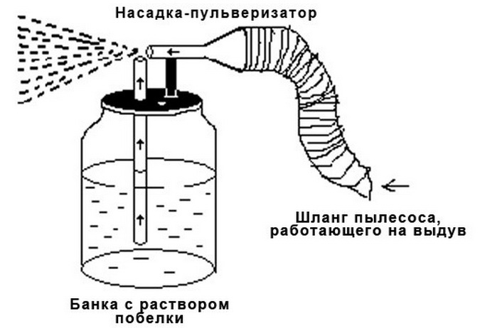 Не все пылесосы наделены функцией выдувания воздуха через специальное отверстие. Однако есть модели, которые приспособлены, помимо основной функции, для побелки. В комплектующий состав входит, кроме основных насадок, полиэтиленовая крышка с трубками. Она является и распылителем, который применяется для побелки потолка или стен. Такую крышку перед началом работы нужно надеть на обычную банку (0,5-1 л) и соединить с помощью шланга с выходным отверстием в пылесосе. После включения пылесоса воздух под давлением будет через шланг попадать в распылитель, затягивать из банки через специальную трубку раствор для побелки, и далее все вместе будет выпрыскиваться наружу через сопло.