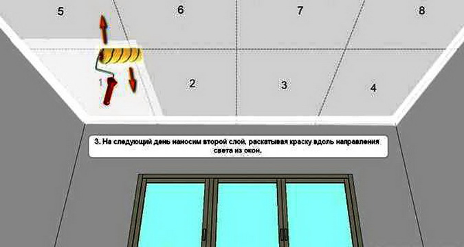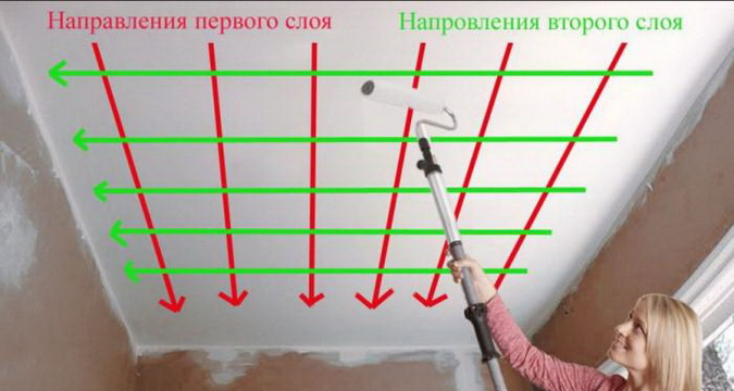 Предварительная грунтовка потолка позволит сделать всего 2 слоя краски, при этом второй слой рекомендуется накладывать перпендикулярно первому. Два слоя необходимы, чтобы можно было избежать разводов и просветов в декоративном покрытии потолка. Если же результат окажется не столь успешным, можно наложить дополнительный слой краски. Главное — выполнять работу аккуратно и не спеша.