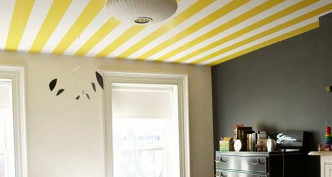 Очень интересно смотрится оформление с делением потолка на чередующиеся полосы обоев различного цвета. Рельефные обои также можно необычно окрасить. Например, основной цвет можно сделать белым, а выделяющуюся фактуру обозначить голубым (или наоборот). Такой потолок будет прекрасно имитировать небо.