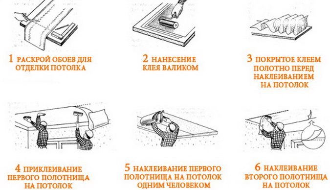 Как и при оклеивании стен обоями, перед наклейкой потолочных обоев лучше предварительно наклеить на поверхность какую-нибудь подклеенную бумагу — оберточную или старые газеты. Это особенно требуется, если потолок имеет неровности, при ровной поверхности такое действие не обязательно. Подклеенную бумагу нужно размещать поперек потолка — вдоль его ширины. Сами же обои далее нужно клеить вдоль длины потолка. Начинать их наклеивание рекомендуется от окна по направлению света в комнату.